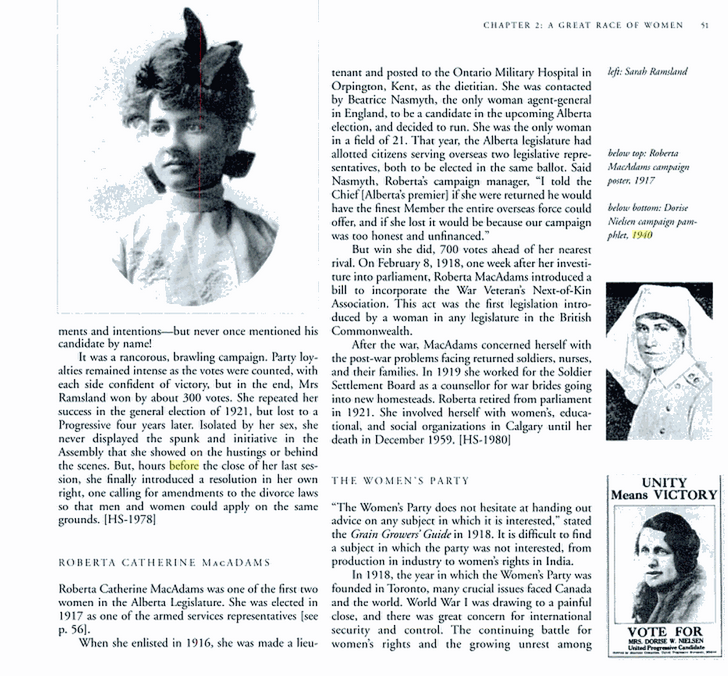 "Roberta left behind a legacy that would have a long-term impact on Canadian society. Before and during her time in office, she had provided tangible aid and support to the rural women who helped settle the Canadian West. She (along with many others) laid some of the groundwork for government measures to meet the needs of soldiers and their families…. Most important, by running successfully for office, Roberta MacAdams helped push open the door to women’s participation in politics”